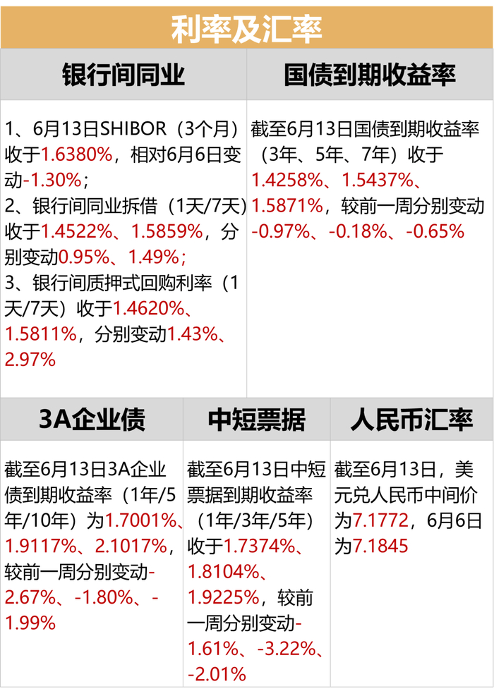 利率方面,本周(6/9-6/13)银行间同业利率整体呈现上行态势;国债收益率整体呈下行态势,企业债收益率呈下行态势。