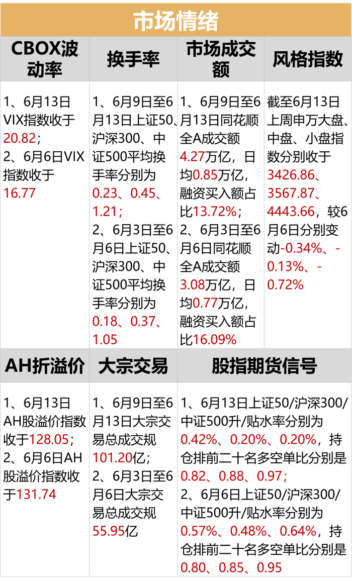 中美两国官员在伦敦进行了为期两天的谈判后宣布就缓解贸易紧张局势达成“框架协议”,短期来看外贸环境压力趋于缓和,但地缘冲突升级再度冲击市场风险偏好。6月18日至19日,陆家嘴论坛即将举行,期间将发布若干重大金融政策,关注下一步增量政策的落地节奏。短期内,A股市场大概率维持震荡行情,重点把握结构性机会。长期来看,外部不确定性加大仍将是基本面面临的一大挑战,但在政策持续发力下,国内经济有望展现较强韧性。在权益类公募基金扩容、中长期资金入市与政策工具护航下,A股资金面或将延续稳中同好态势。居民财富同金融资产加速再配置的趋势愈发明确,后续可重点观察市场情绪面的修复节奏。