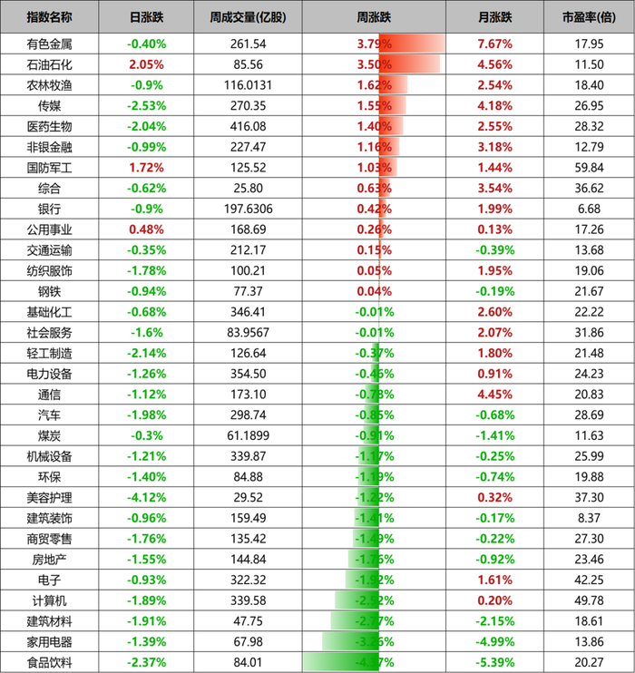 对比上周A股行情,本周A股略显震荡。行业方面,31个申万一级行业中有13个实现上涨,其中有色金属、石油石化、农林牧渔、传媒涨幅靠前;而食品饮料、家用电器、建筑材料与计算机跌幅较大。