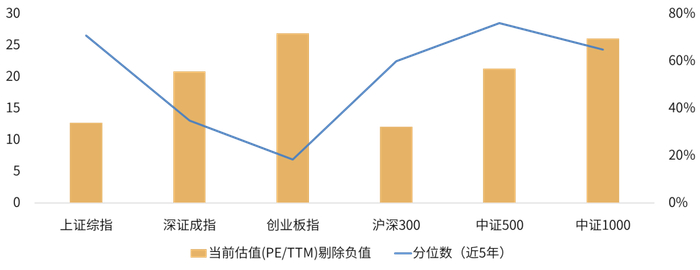 目前上证综指PE(TTM,剔除负值)下行至12.67倍,历史分位数下行至70.82%。深证成指PE(TTM,剔除负值)上行至20.82倍,历史分位数上行至34.78%。创业板指PE(TTM,剔除负值)上行至26.85倍,历史分位上行至18.39%。