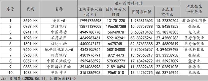 本周(6/9-6/13)沪港通净流入资金51.58亿,深港通净流入资金90.03亿,合计净流入141.60亿。截至6月11日,南向资金近一周个股增持净买入额前三分别为美团-W、建设银行与中国移动。