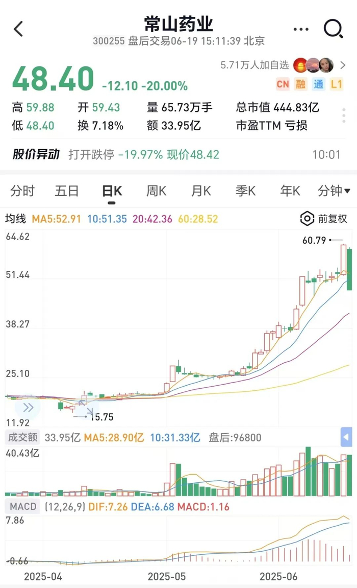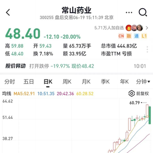 医药板块集体回调,常山药业迎来20%跌停,此前,常山药业自4月份低点,两个多月时间最高涨幅接近3倍。广生堂、翰宇药业跌超11%,永安药业跌停等。