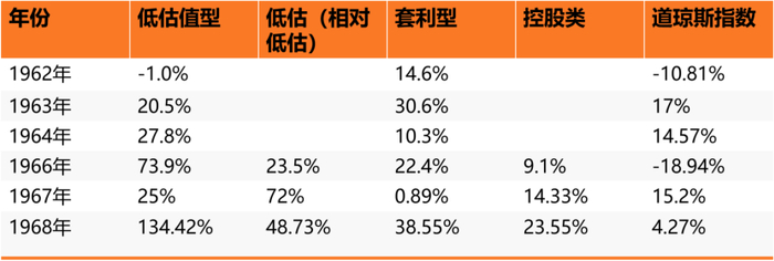 1962年巴菲特32岁,身价100万,当年基金收益14%,其中低估值型投资收益-1%,套利型投资收益14.6%,巴菲特称套利类投资是熊市跑赢的原因,这一阶段的投资策略还有非常明显的格雷厄姆烙印。