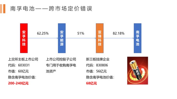 2024年8月,市场持续低迷,亚锦科技股价每股1.5元左右,对应南孚电池市值60亿左右,而同一块资产在A股的隐含估值200亿左右,价差较为明显,这也是大股东持续收购亚锦科技少数股东权益的底层逻辑。同时,安孚科技2024年4月报价每股2元要约收购亚锦科技小股东股份5%,存在肉眼可见的套利机会,套利收益率预计30%以上。