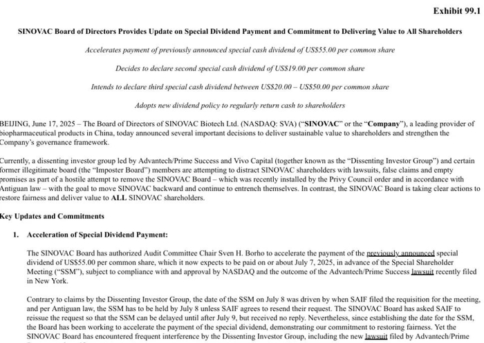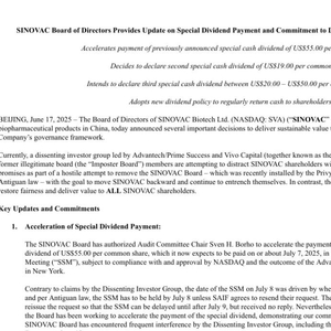 6月18日,科兴生物董事会发布了关于特别股息支付和承诺为所有股东创造价值的最新消息,包括加快支付之前宣布的每股55.00美元的特别现金股息(7月7日)、决定宣布每股19.00美元的第二次特别现金股息、计划宣布每股20.00美元至50.00美元的第三次特别现金股息以及采用新股息政策定期向股东返还现金、探索其他上市地等。