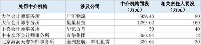 此次被罚没金额最大的是大信会计师事务所(简称“大信所”)。证监会公布的两则行政处罚决定书显示,大信所因涉嫌星星科技、广汇物流财务造假被罚没约1800万元。相关签字会计师一并受罚,合计罚款240万元。