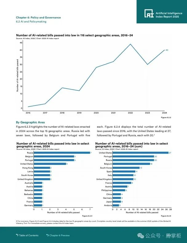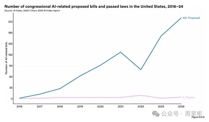 美国联邦AI相关法规从2023年的25个增至59个,州级法律从49个增至131个。