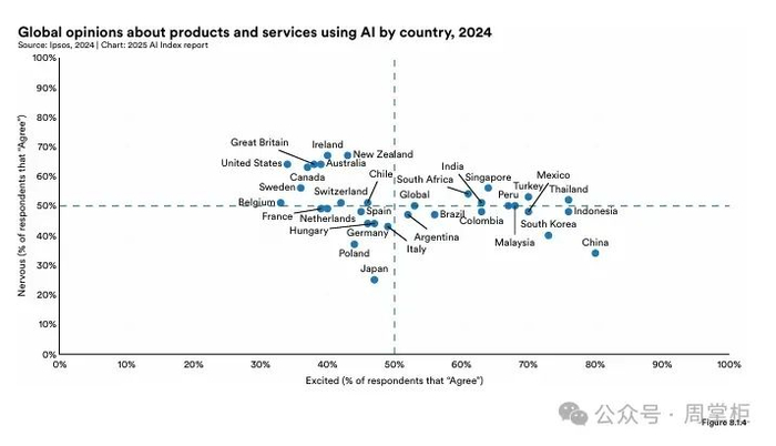 2024年,全球对AI的乐观情绪从2022年的52%升至55%。亚洲国家如中国(83%)、印尼(80%)和泰国(77%)对AI的益处持高度乐观态度,而加拿大(40%)、美国(39%)和荷兰(36%)的乐观情绪较低。