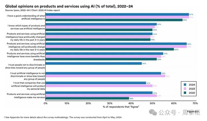 尽管如此,多个国家的乐观情绪有所提升,如德国和法国均增长10%。然而,数据隐私和偏见问题仍是公众关注的焦点,60%的人预期AI将改变工作方式,但仅36%担心被取代。
