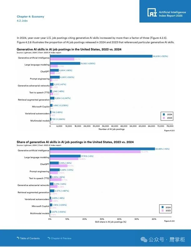 AI技能需求也在增长,美国AI技能岗位占比从2023年的1.4%升至1.8%,生成式AI技能需求增长三倍。