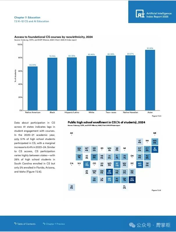 全球三分之二的国家已提供或计划提供K-12计算机科学教育,非洲和拉美进步显著。美国计算机科学学士学位毕业生在过去十年增长22%,但基础设施限制(如非洲的电力短缺)和教师培训不足(仅46%的K-12计算机科学教师感觉有能力教授AI)仍是挑战。81%的美国K-12计算机科学教师认为AI应纳入基础教育。