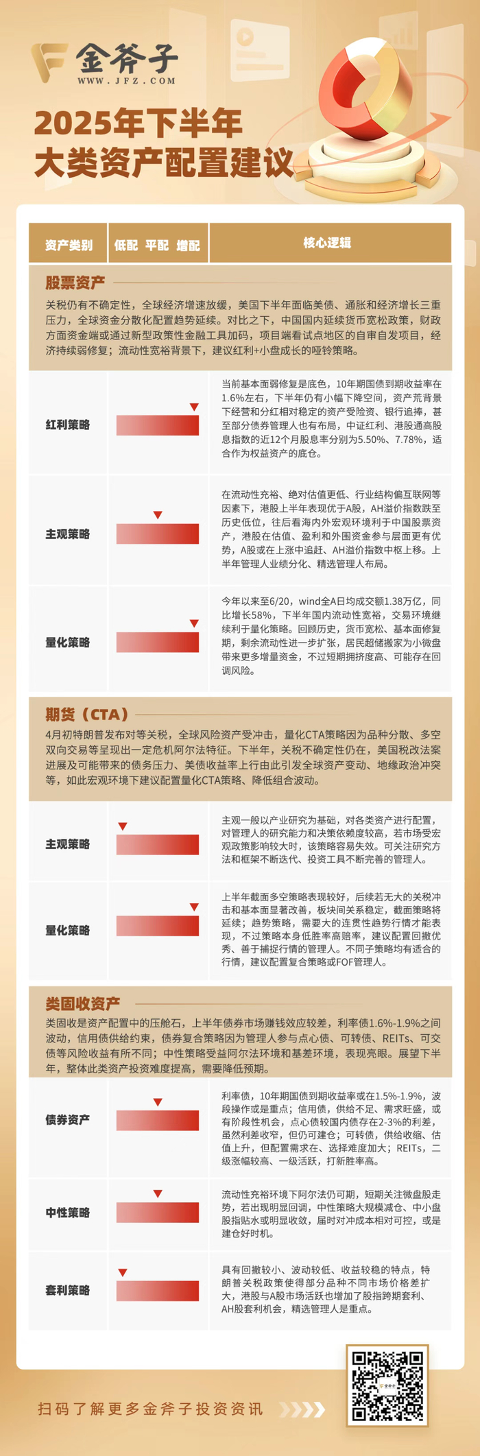 展望下半年,人民币有望持续升值,A股与港股在全球动荡背景下更具配置价值,可以挑选更具选股实力与赛道判断能力,投研背景强大的管理人及其产品进行配置。量化策略方面建议产品组合尽量做到收益来源、策略风格多样化分散化,提高产品组合的抗风险能力。债券方面目前非债市大年,更加考验债券管理人能力,可适当关注配有可转债、境外债、REITs等资产的固收类产品。