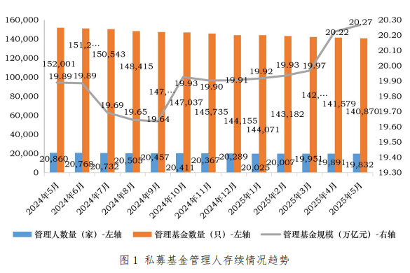 截至 2025 年 5 月末,存续私募基金管理人19,832家,管理基金数量 140,870 只,管理基金规模20.27 万亿元。其中,私募证券投资基金管理人 7,802 家;私募股权、创业投资基金管理人 11,835 家;私募资产配置类基金管理人6 家;其他私募投资基金管理人 189 家。