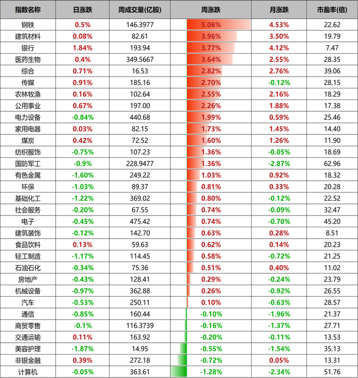 对比上周A股行情,本周A股继续反弹。行业方面,31个申万一级行业中25个实现上涨,其中钢铁、建筑材料、银行与医药生物涨幅靠前;而计算机、非银金融、美容护理与交通运输跌幅靠前。