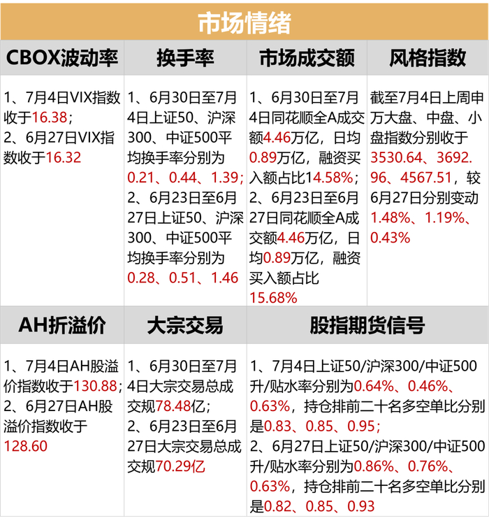 本交易周期(6/30-7/4)上证综指上行1.40%,深证成指上行1.253%,创业板指上行1.50%。两市成交7.07亿元,周度日均市场成交额为1.41万亿元,日均增长率为-2.70%。上证综指换手率为0.99%,成交额2.73万亿元;深证成指换手率2.83%,成交额为4.34万亿元;创业板指换手率为4.46%,成交额2.10万亿元。