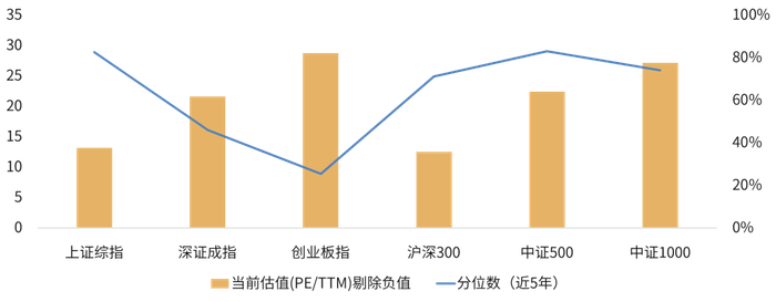 目前上证综指PE(TTM,剔除负值)上行至13.15倍,历史分位数上行至82.54%。深证成指PE(TTM,剔除负值)上行至21.6倍,历史分位数上行至45.957%。创业板指PE(TTM,剔除负值)上行至28.71倍,历史分位上行为25.39%。