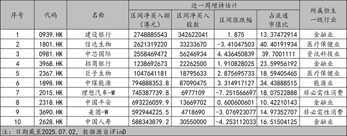 本周(6/30-7/4)沪港通净流入资金43.96亿,深港通净流入资金82.93亿,合计净流入126.89亿。截至7月2日,南向资金近一周个股增持净买入额前三分别为建设银行、信达生物与中芯国际。