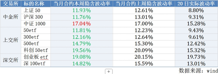 当月本周、上周隐含波动率与20日实际波动率对比如下: