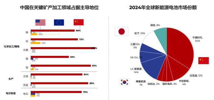 支撑这场变革的底层驱动力,是行业构建了全球领先、自主可控、结构完整且成本高效的全产业链体系。正是这一体系优势,成为本土品牌蓬勃发展,而德日等传统巨头电动化转型步履维艰的根本原因。以价值占比较高的核心部件——动力电池为例,中国已占据全球超三分之二的制造份额。此外,在正极材料(镍、钴、锰等)、负极材料(石墨)、电池制造(除部分上游锂矿外)等核心环节,中国普遍占据70%以上的主导地位,是全球电池产业的绝对领导者。正是这种全面而强大的产业链掌控力,奠定了中国电动汽车革命成功的基石。