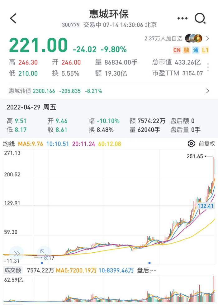 今天开盘,总市值近500亿的惠城环保凶猛杀跌,也一度冲上热股榜第一。而其股价也从2022年4月最低的8.17元,一度涨到251元,两年多时间涨幅最高接近30倍。