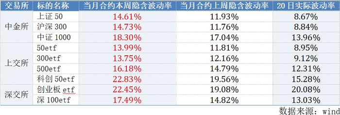 当月本周、上周隐含波动率与20日实际波动率对比如下: