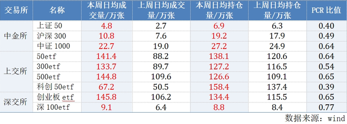 从成交量来看,各期权品种的成交量有所上升,持仓量有所下降。当月合约成交量PCR比值(同期认沽期权成交量之和/同期认购期a权成交量之和)普遍低于1,表明市场对认购期权的需求高于认沽期权,反映出投资者对后市的乐观情绪。具体标的成交量情况如下图所示: