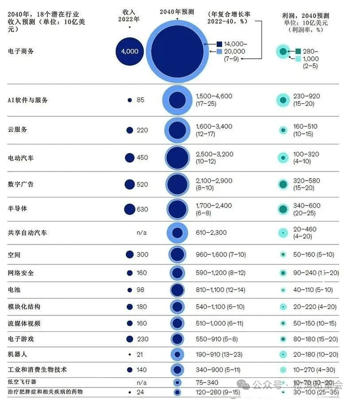 到2040年,预计有18个领域可能重塑全球经济,涵盖从人工智能软件和服务到网络安全,从未来的空中交通到肥胖和相关疾病的药物,从机器人到非医疗生物技术等。这些行业预计将产生2万亿至6万亿美元的利润,在全球GDP中的集体份额可能从当前的4%增加到10%-16%。具体行业的收入和利润预测如下: