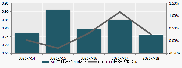 挑选出中证1000指数作为标的,观察上周PCR值的变化情况。可以看到PCR比值和标的涨跌二者走势出现负相关性,即当行情向上的情况下,认购期权的交易量大于认沽期权。具体走势如下图所示: