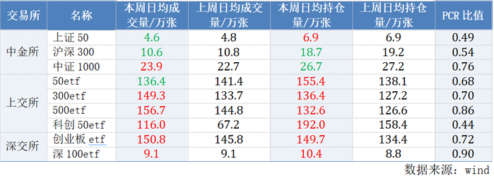 从成交量来看,各期权品种的成交量涨跌互现,特别注意的是科创50etf成交量和持仓量均有较大幅度的增加。当月合约成交量PCR比值(同期认沽期权成交量之和/同期认购期权成交量之和)普遍低于1,表明市场对认购期权的需求高于认沽期权,反映出投资者对后市的乐观情绪。具体标的成交量情况如下图所示: