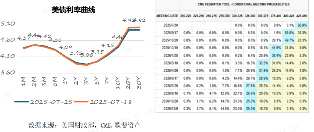 美债收益率走势:7.18日至7.25日区间,美债收益率曲线走平,1年期美债利率上行1BP至4.09%,2年期美债上行3BP至3.91%,5年期美债下行1BP至3.95%,10年期美债利率下行4BP至4.40%,30年期美债下行8BP至4.92%。利差方面,短端上行,长端下行,10年期和2年期美债利差当周收窄7BP至49BP。截至7月25日,根据联储观察工具显示,Fedwatch 预期 2025 年 7 月降息 25bp 的概率为 3.1%,上周为 4.1%;9 月份降息的可能性降至 59.8%。全周美债市场主要驱动因素包括贸易谈判放缓,以及经济数据发布,下周建议关注联储议息会议,以及财政部再融资计划和非农等经济数据发布。
