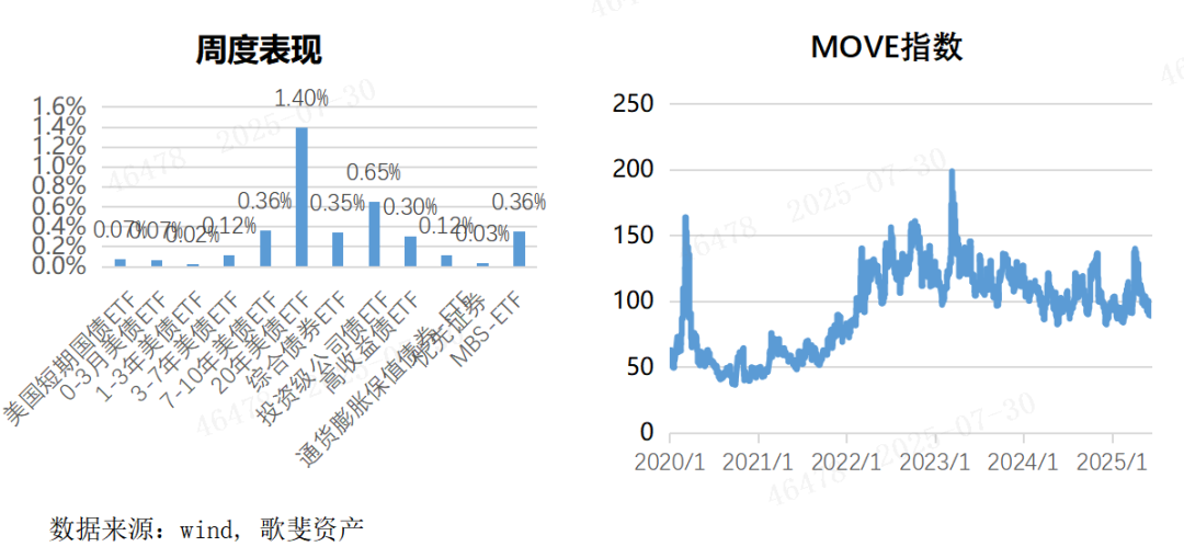 当周美债ETF大都上涨,长债表现更佳,0-3月美债ETF上涨0.07%,1-3年美债ETF上涨0.02%,3-7年美债ETF上涨0.12%,7-10年美债ETF上涨0.36%,20年美债ETF上涨1.40%。综合债券ETF上涨0.35%,投资级债券ETF上涨0.65%,高收益债ETF上涨0.30%,优先证券上涨0.03%。当周债券市场MOVE指数(国债期权的波动率)小幅回落82,主要反映不确定性消散后美债市场相对平稳。