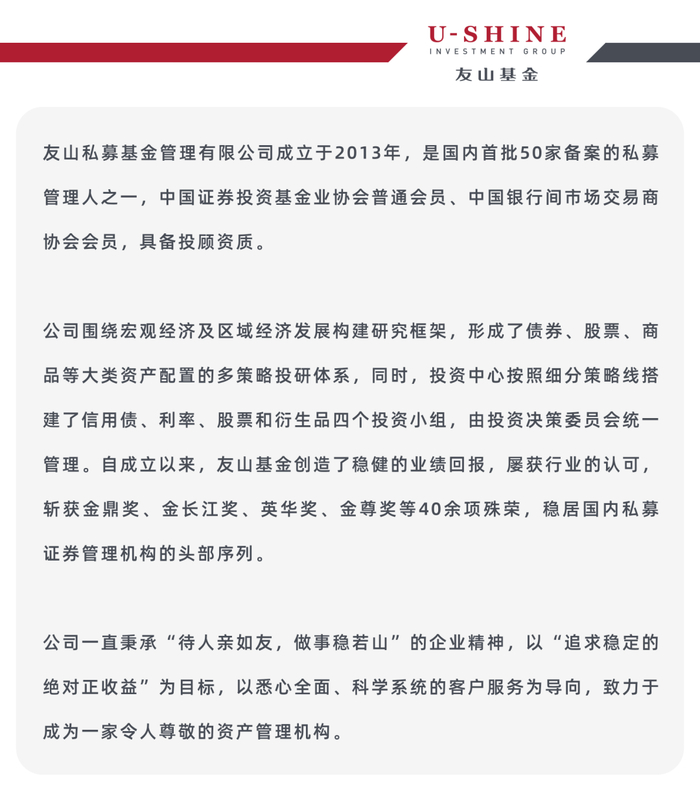 友山基金诚挚感谢投资人与合作伙伴的信任,愿继续并肩前行,不断探索因时制宜的、多样化的资产组合方式,共同见证长期投资的时间价值。