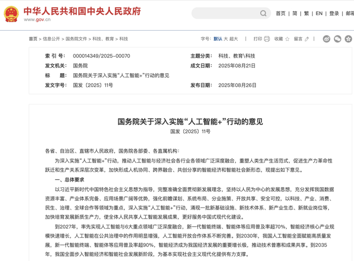 8月26日,智能体也开始写入国务院文件。国务院印发《关于深入实施“人工智能+”行动的意见》(下称《意见》),明确表示,到2027年,实现人工智能与6大重点领域广泛深度融合,新一代智能终端、智能体等应用普及率超70%。十年后,我国全面步入智能经济和智能社会发展新阶段。