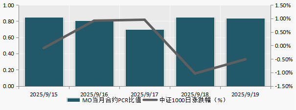 挑选出中证1000指数作为标的,观察上周PCR值的变化情况。可以看到上周中证1000震荡,PCR比值仍然小于1。表明市场还是多头形态,总体情绪偏乐观。具体走势如下图所示: