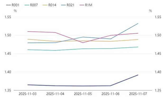 上周(11.3~11.7),银行间市场各期限回购利率整体呈“短期平稳、长期微升”态势。其中,R001从11月3日的1.3646%小幅波动至11月7日的1.3916%,累计上行2.7个BP;R007从1.4604%升至1.4677%,累计上行0.73个BP;R014、R021保持稳定,分别稳定在1.48%~1.49%、1.48%~1.53%区间。1个月期的R1M波动相对明显,从1.5098%降至1.5052%,累计下行4.6个BP,结束前期微升态势。