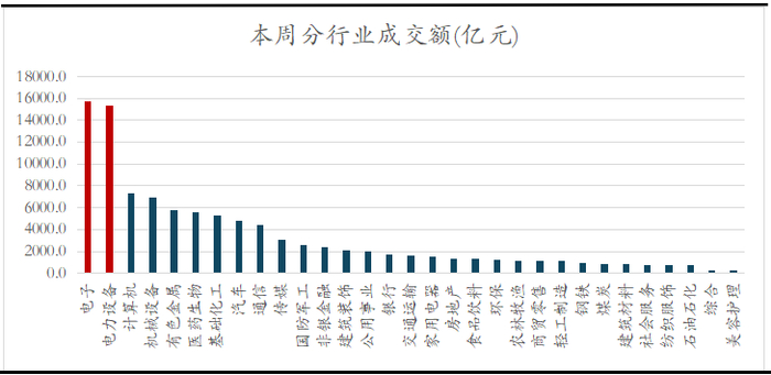 具体而言,电子、电力设备、计算机、机械设备等成长板块成交额居前,合计占全市场成交额近40%,尤其是电子、电力设备板块,成交额均突破万亿大关,分别占全市场成交额的16%、15%,遥遥领先其他板块,凸显资金对高景气赛道的持续聚焦。能否有效参与高景气赛道,成为本周投资的关键。