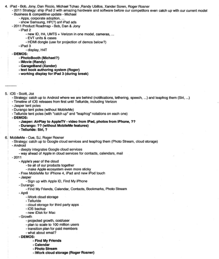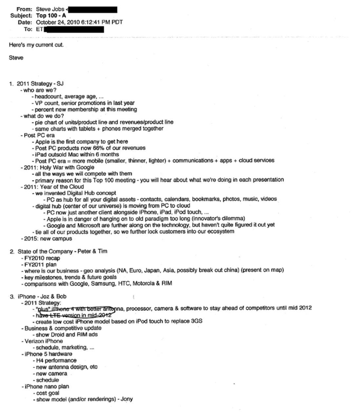 2010 年乔布斯写给菲尔·席勒的 “Top 100 — A” 会议代号邮件,透露了他对于当时公司最重要的事情的看法。他认为,苹果正在进入“后 PC 时代”,苹果是第一家进入这个时代的公司。iPad 在 6 个月内销量超过了 Mac ,后 PC 产品占苹果营收的 66% 。后 PC 时代的大趋势是“更移动化(更小、更薄、更轻)+ 通信 + 应用 + 云服务”。他意识到在后 PC 时代,云服务将成为云端的“数字中枢” ,是整个生态系统的核心部分,将苹果所有的产品联系起来,增强用户体验和消费者在苹果生态系统中的黏性。他把 2011年称为“云服务之年” ,是当年战略重点,也是未来苹果日益重要的服务业务的开端。