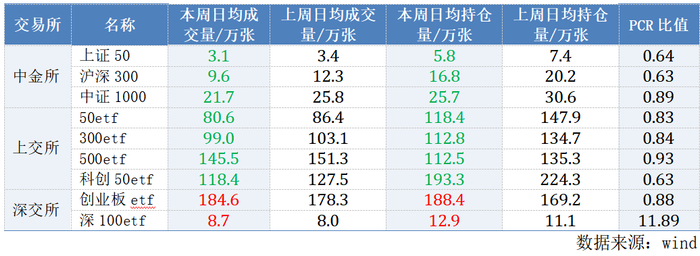 从成交量来看,各期权品种的成交量有所减少。当月合约成交量PCR比值(同期认沽期权成交量之和/同期认购期权成交量之和)仍然普遍低于1,表明市场对认购期权的需求高于认沽期权,反映出投资者仍然对后市保持乐观态度。具体标的成交量情况如下图所示: