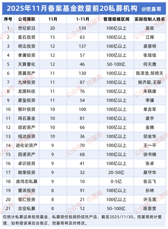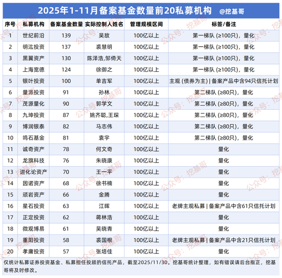 一个显著的趋势是,头部量化私募通过密集备案新产品,正在快速扩张其策略版图和资产管理规模。下表为1-11月备案产品数量排名前20的私募机构概览: