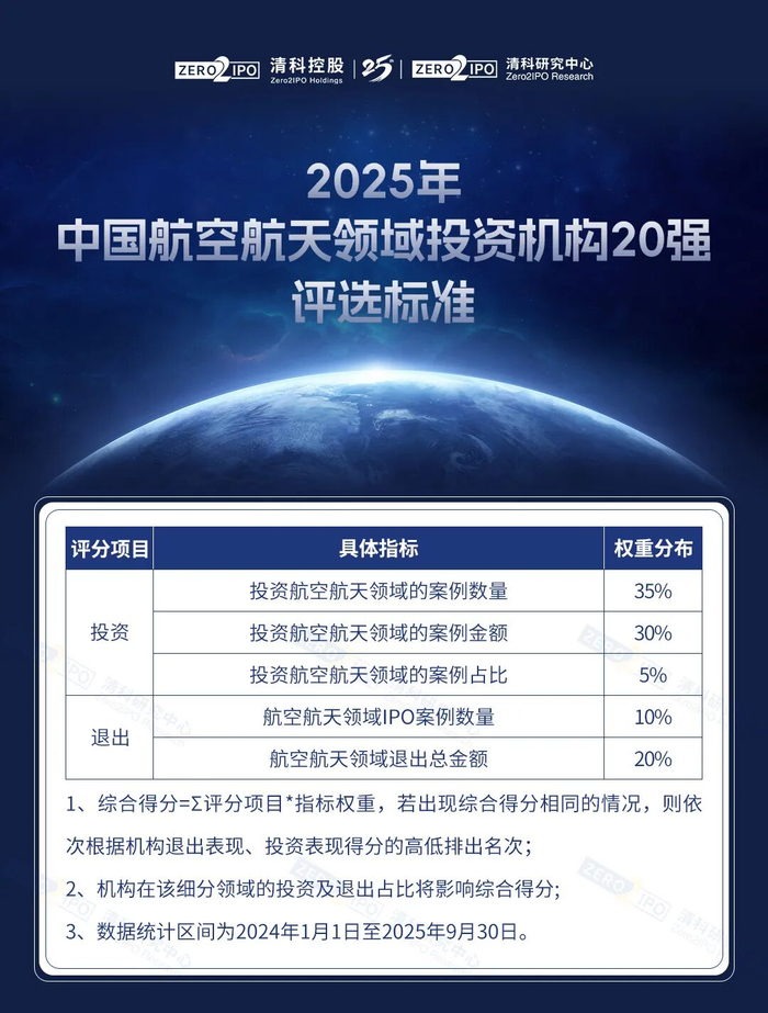 “2025年中国航空航天领域投资机构20强”榜单全部采用可量化的评分标准,共包含投资和退出两大维度,涉及了投资案例数、投资金额、投资集中度、IPO 数量、退出金额指标五大指标,并对各指标赋予相应权重。榜单评选的数据统计时间范围为 2024年至2025年前三季度,在此时间段内通过上述标准计算得出每家投资机构的综合得分。