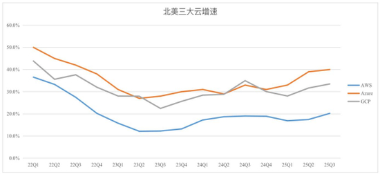 全球采购AI token并进行二次加工的B端与C端收入,很难进行统计,但实际上我们可以借用云厂商收入增速来监控:如果AI token的下游采购和加工(模型厂或AI应用)有利可图,云收入的增速就不应该出现明显的减速。截至三季报数据,北美三大云厂以及中国的阿里云,增速都还在不断往上走。这至少证明了AI投资的第三块经济价值依旧成立。