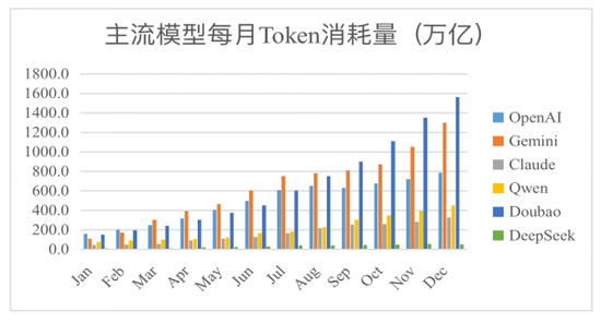 第一,推理成为常态。2025年初,ChatGPT刚诞生逻辑推理能力,刚学会深思熟虑。2025年底,推理和长时间思考已经成为了所有大语言模型的标配,思考时间从1分钟扩展到了半小时,某些任务甚至到数小时。成本方面,虽然不及2024年的降本速度,但前沿模型在能力提升的同时,百万输入token的单价也下调了50%。而对于同一讨论内容,行业基本上普及了更为便宜的输入“缓存”,其成本也从每百万token 1.25美元下调到0.125美元,下降了90%。在长时间思考和推理成本下降的趋势带动下,所有模型的推理应用token消耗数,都出现了每月暴涨。这是AI技术得到应用普及,第一层最有力证明。