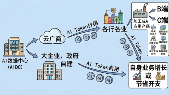 我们首先要在脑中建立一个模型。如图所示,AI作为一种生产力要素,由数据中心(AIDC)所生产。这个世界约60%的AIDC,被少数几家“云服务厂商”承包建设了,剩下的由某些大企业自行内部建设,例如Meta、特斯拉等,或由主权政府进行投资建设。AIDC产生的AI智能原材料,无论是基础算力还是模型服务,都可以Token来计算。这些AI Token要么由云厂商外售分销给百行千业,要么被大企业和政府内部自产自用。各行各业自产或采购了AI Token原材料后,要么用以拉动自身业务的收入增长,或节省开支,要么进一步加工成智能产品卖给B端或C端消费者,例如聊天机器人、图片视频生成器、企业BI决策智能、氛围编程、演示文档制作、数据表格制作等智能产品。