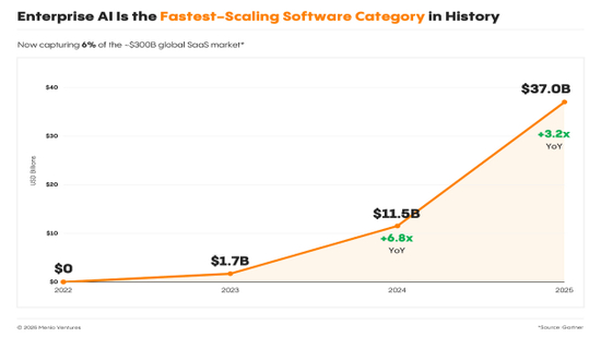 至于第三块AI经济价值,Menlo Venture在其最新495位美国企业 AI 决策者的调研报告中,估算了北美企业的AI应用开支情况:相比2024年,2025年北美企业AI开支达370亿,同比飞速增长了3.2倍。其中AI软件的开支过半超过190亿美元,已经占到3000亿SaaS市场的6%。相比2024年53%的比例,2025年有76%的企业不再自建,而是从外部购买AI应用。这都说明二次加工的AI应用,虽然基数低,但增速快,并在企业采购中逐渐被接受。