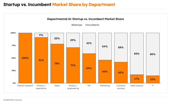 如今的西方科技产业,早已不是“和气生财”的互联网时代——彼此业务井水不犯河水。市场还在关心OpenAI合纵连横,到处施展“循环供应链融资”的财技,而没留意到,今天每家企业实际上都在相互拆台:OpenAI正携8亿用户进军广告与电商业务,争夺谷歌搜索的流量市场;谷歌正在其搜索引擎里,引入“AI模式”拦截传统第三方网页的流量,并接入决策助手完成商业闭环,逼得亚马逊在9月份实验性的断开了所有AI的搜索请求;GPU芯片在蚕食着CPU的服务器市场,而另一边TPU又在悄然地在Gemini模型之外,在Cluade、ChatGPT和Meta AI等英伟达大本营的推理场景中埋下种子,慢慢生根发芽;Anthropic开始对所有的传统软件范式发起“釜底抽薪”的战争号角,而Chatgpt在平台中引入了应用SDK,将传统软件解构成“能力加数据”;Meta发布了第二代AI眼镜,2025年卖出了接近早期iphone的400万销量,希望用全新的交互和智能,取代我们的“掌上生活”;越来越多的AI应用收入被初创公司截胡,Menlo数据显示(如下图),初创企业的AI收入份额从去年的36%到今年的63%,在位的大企业起步早、资源多,却在2025年开始丢盔弃甲。