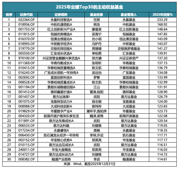 在一个结构性机会层出不穷的背景下,主动权益基金再一次体现出其选股层面的优势。万得偏股混合基金指数(885001)涨幅33.19%,时隔三年重新跑赢沪深300。主动权益基金也在低迷了三年后,重新开始回归。2025年主动权益类基金不仅正回报产品占比超过95%,更涌现出70多只“翻倍基”。