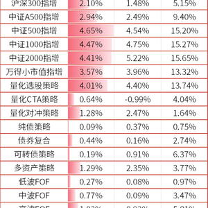 本周跟踪的量化对冲策略普遍上涨,产品平均收益为1.28%: