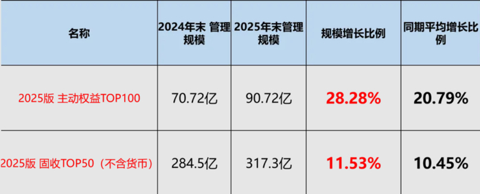 看一组数据,2025年主动权益TOP100榜单中的基金经理全年规模增长比例为28.28%,同期公募主动权益基金平均增长规模为20.79%。