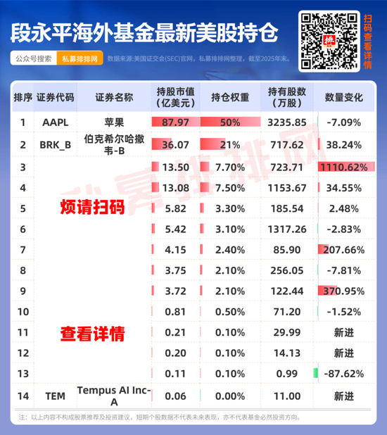 截至2025年底,段永平旗下海外基金共持有14只美股标的,持股总市值约为174.89亿美元(折合人民币近1200亿元),比2025年三季度末增加超28亿美元。行业上侧重信息技术行业,持股总市值接近110亿美元,占比约63%。(点此查看持仓)