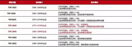 华夏基金:目标日期基金大多以退休日期命名,一般会每隔5年设置一个基金。比如“目标日期2040基金”(TDF2040)主要是为将在2038至2042退休的人群设置的。如果你在这个区间,直接买这个产品就行了。